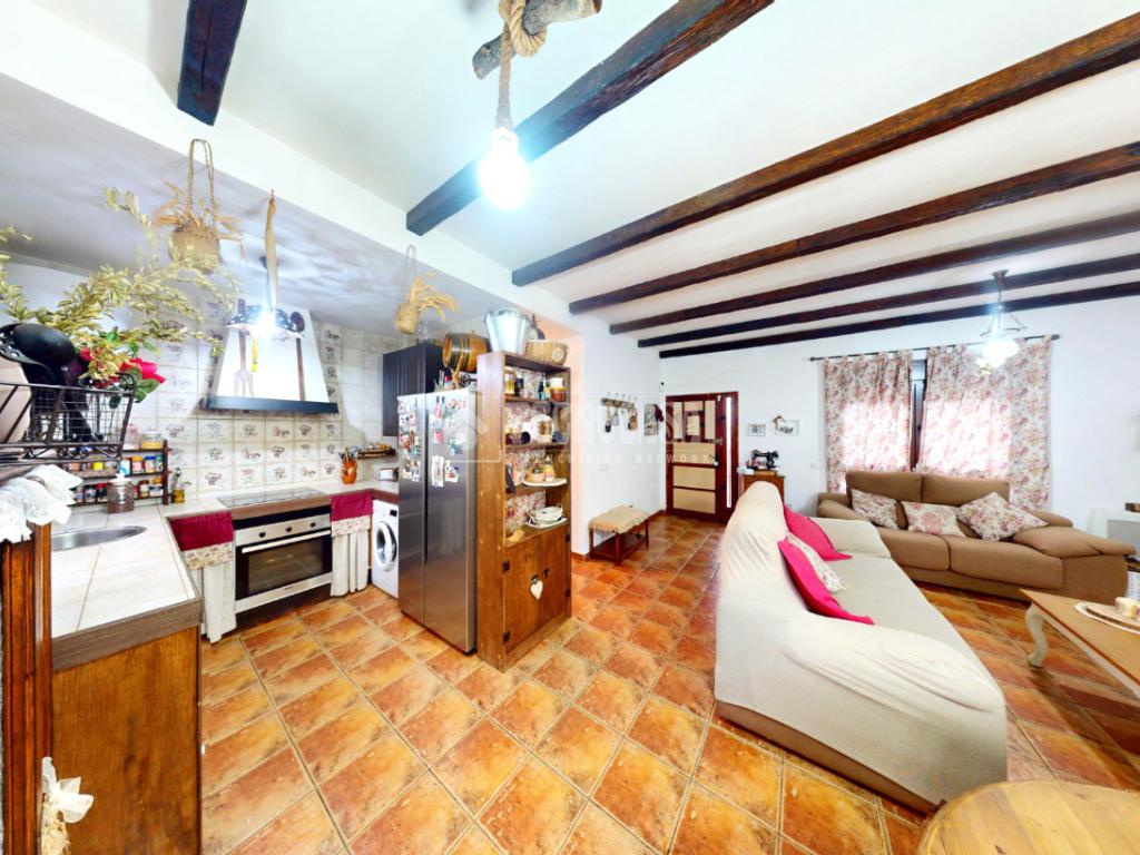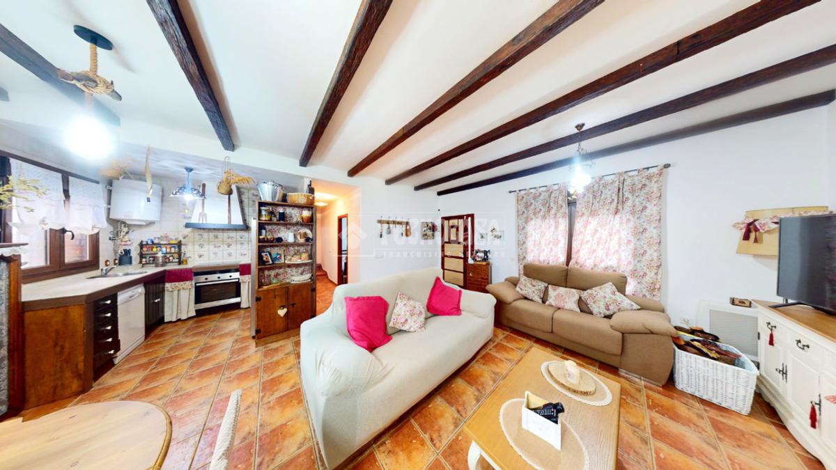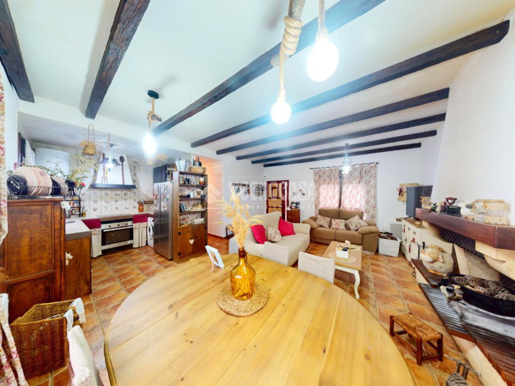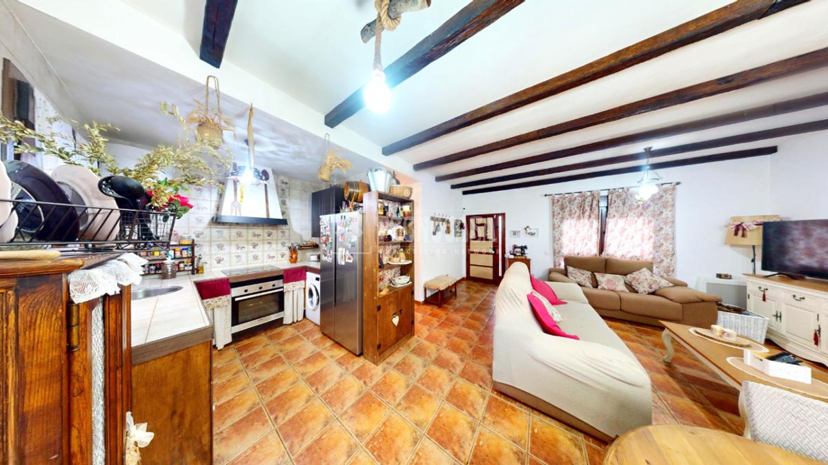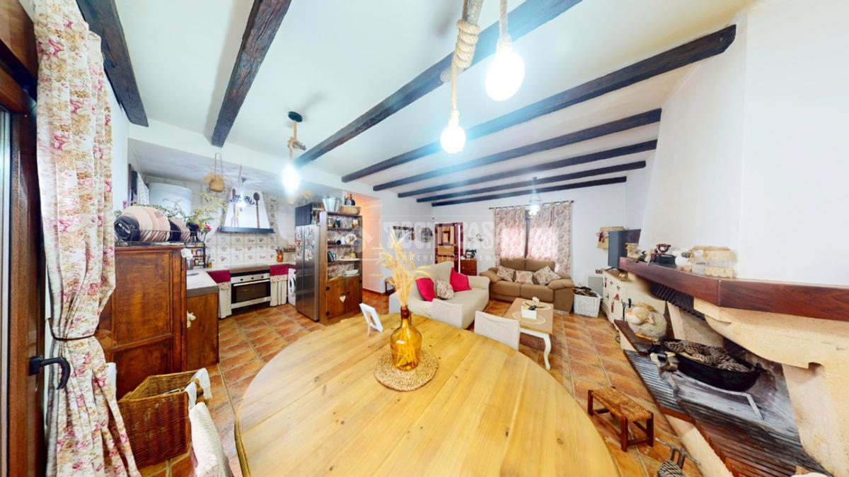 El salón-comedor ofrece un ambiente cálido y confortable, con techos decorados con vigas vistas de madera que aportan carácter y personalidad a la estancia. La chimenea se convierte en el punto central del espacio, ideal para disfrutar de reuniones familiares en invierno. Los suelos rústicos en tono terracota combinan a la perfección con el estilo acogedor de la vivienda. Además, cuenta con grandes ventanales y salida directa al patio trasero, lo que garantiza una excelente entrada de luz natural durante todo el día.